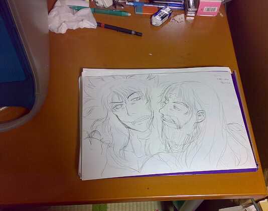 おかげさまで、小汚い私の机の全貌まで明らかに…(大汗)。写ってる紙はA4サイズなんですが、普段描いてる原稿用紙のサイズがB4なので狭い狭い。